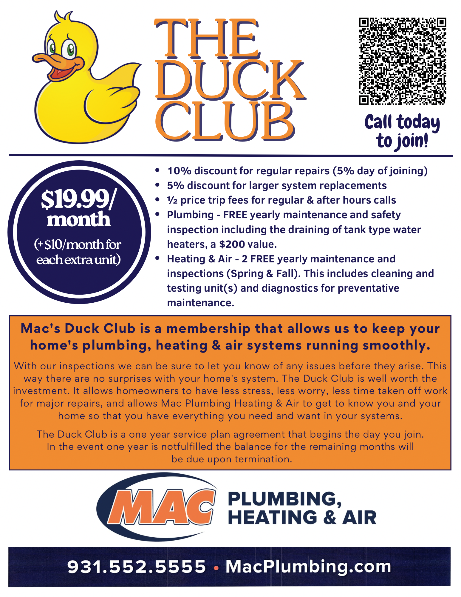 Mac’s Duck Club is a membership that allows us to keep your home’s plumbing, heating & air systems running smoothly.